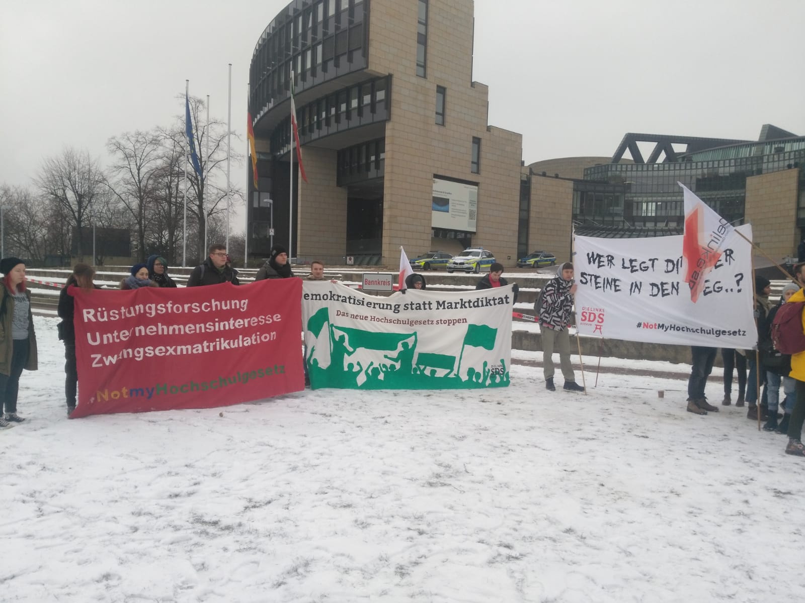 Aus diesem Grund fand heute vor dem Landtag in Düsseldorf eine Kundgebung in Protest gegen die Realisierung der Vorhaben von CDU und FDP für das neue Hochschulgesetz statt. Es waren ca. 100 Student*innen, die gegen das neue Hochschulgesetz auf der Straße waren.