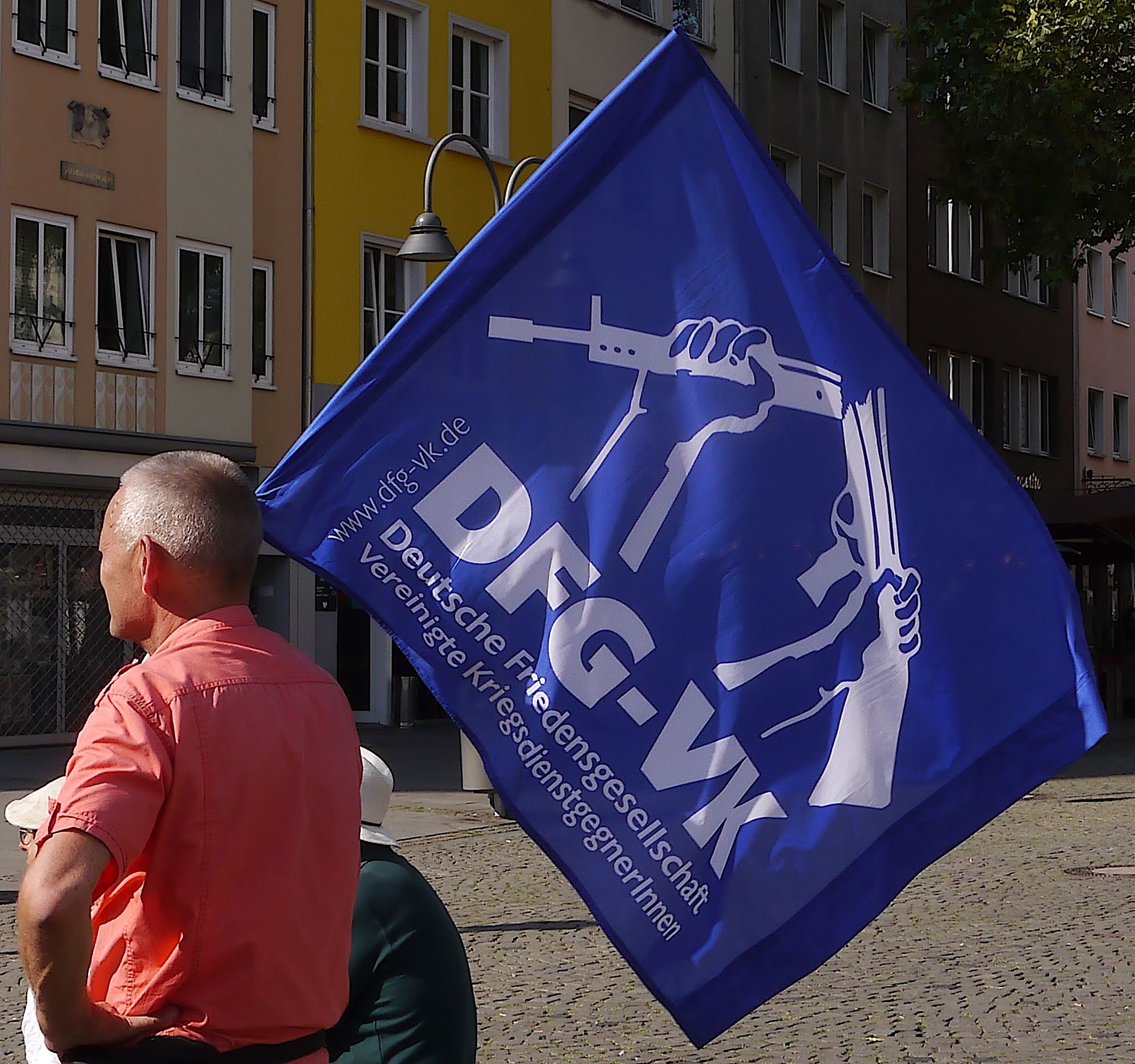 Michael Sünner mit DFG-VK-Flagge auf dem Alter Markt, Köln, am 31.8.2019. Foto: Klaus Reinhard Müller (CC BY-SA 4.0)