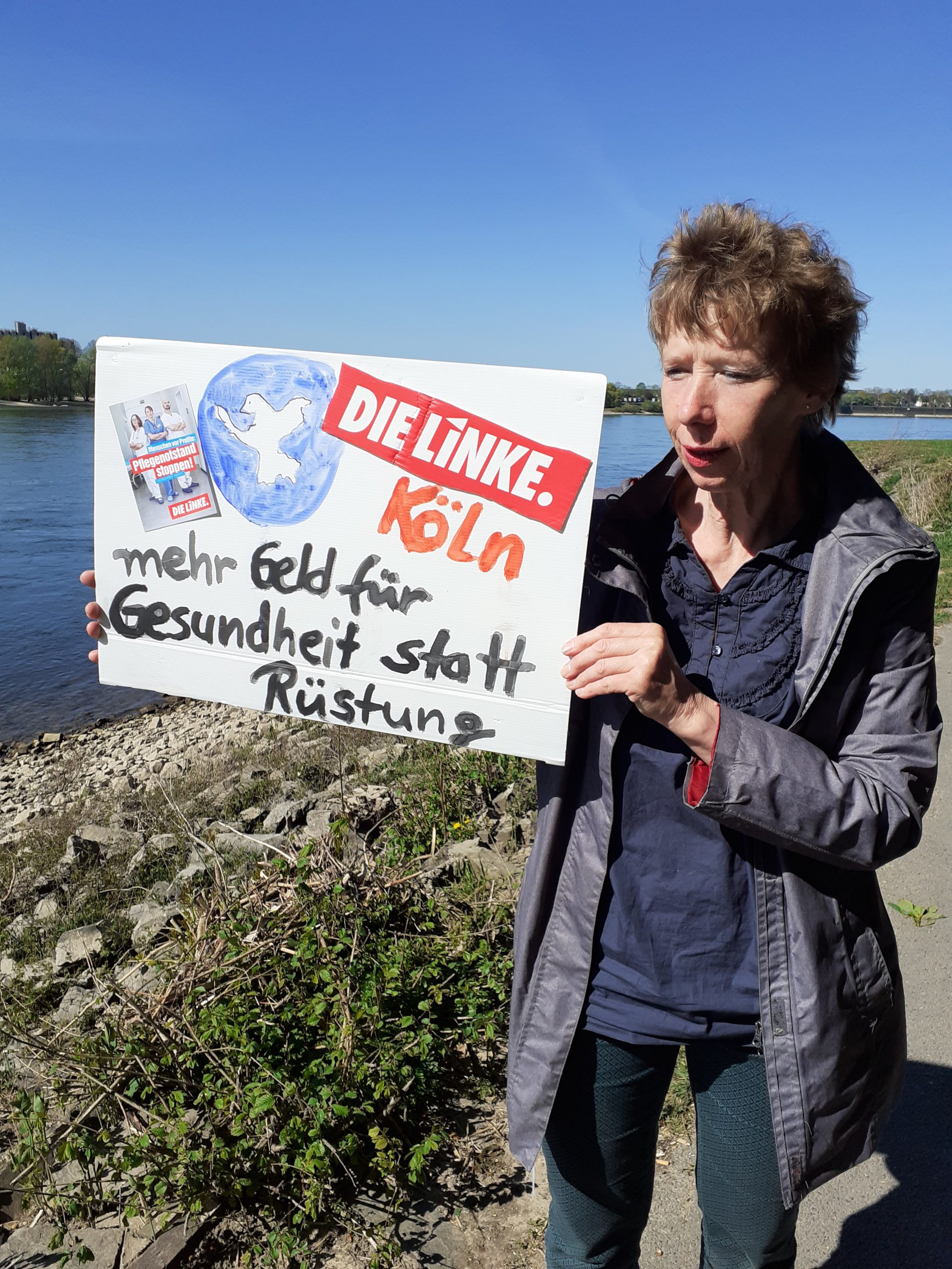 Gewerkschafterin Beate Hane-Knoll beim Osterspaziergang am 11.4.2020 am Rheinufer in Köln: „Mehr Geld für Gesundheit statt Rüstung!“. Foto: privat