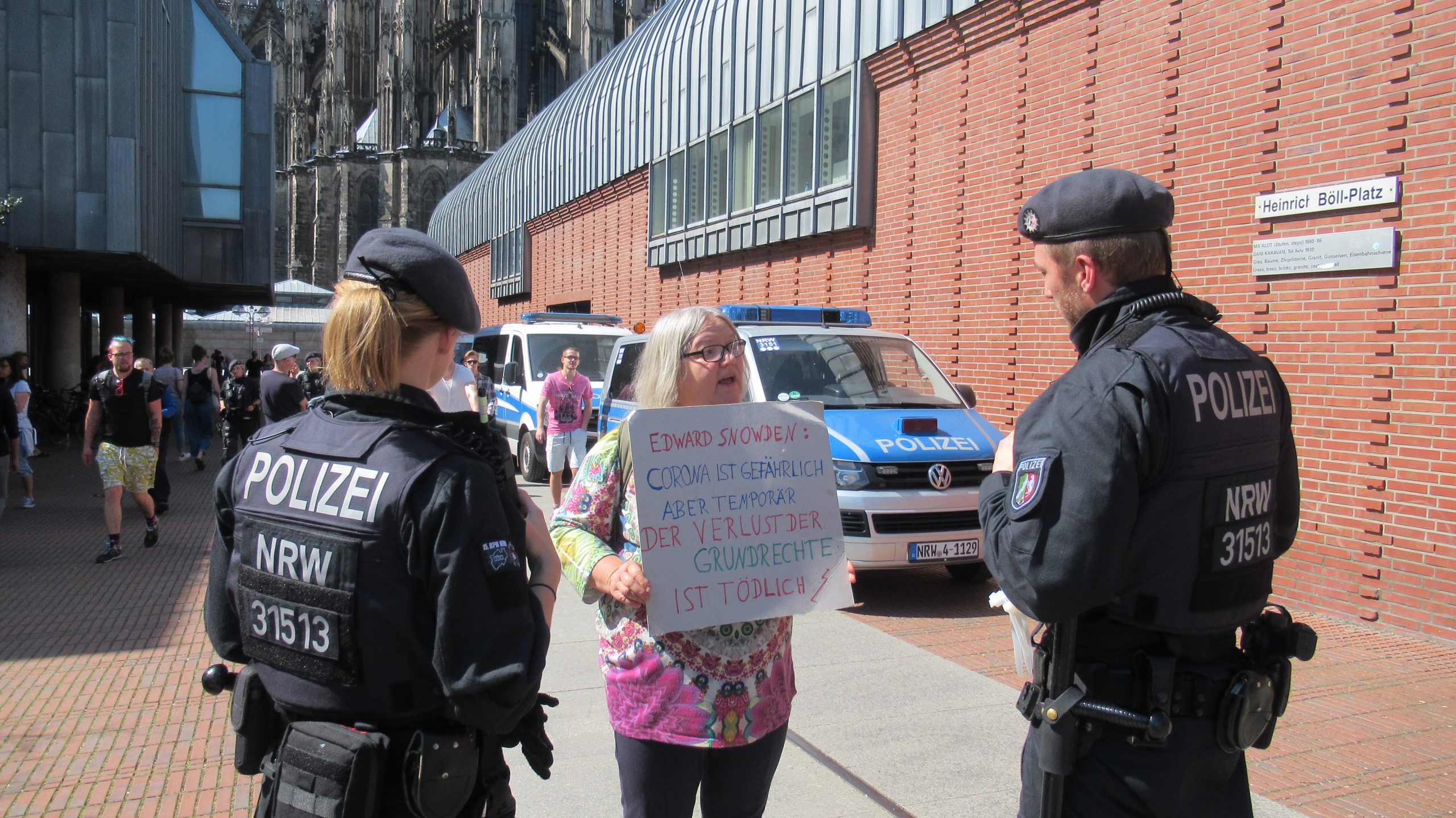 Osterspaziergang mit Friedensbotschaft: „Edward Snowden: „Corona ist gefährlich, aber temporär. Der Verlust der Grundrechte ist tödlich.“ Diskussion mit Polizist*in auf dem Heinrich-Böll-Platz am 11.4.2020. Foto: privat