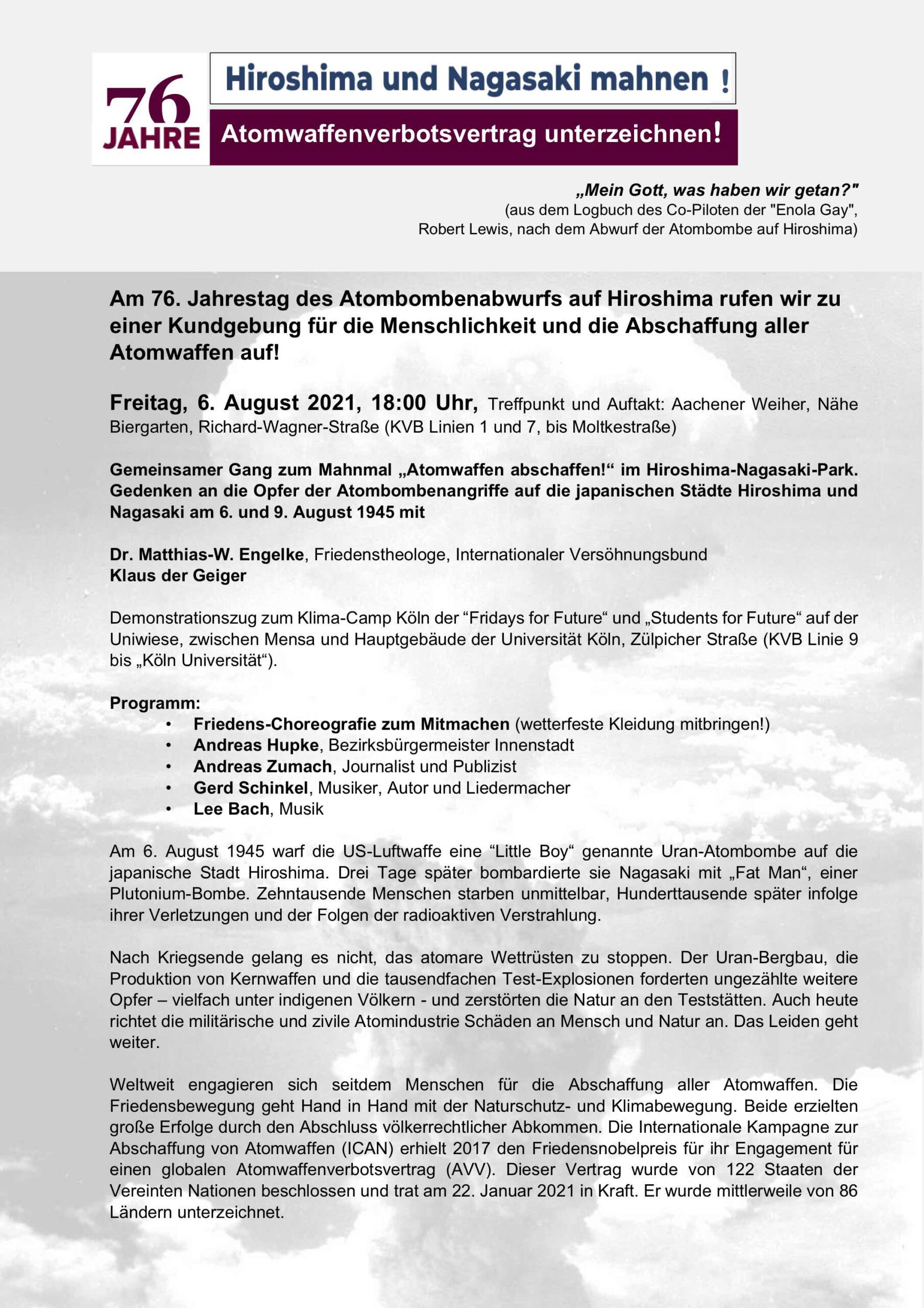 Mitmachen: Kundgebung für die Menschlichkeit am Hiroshima-Tag, 6. August 2021, in Köln