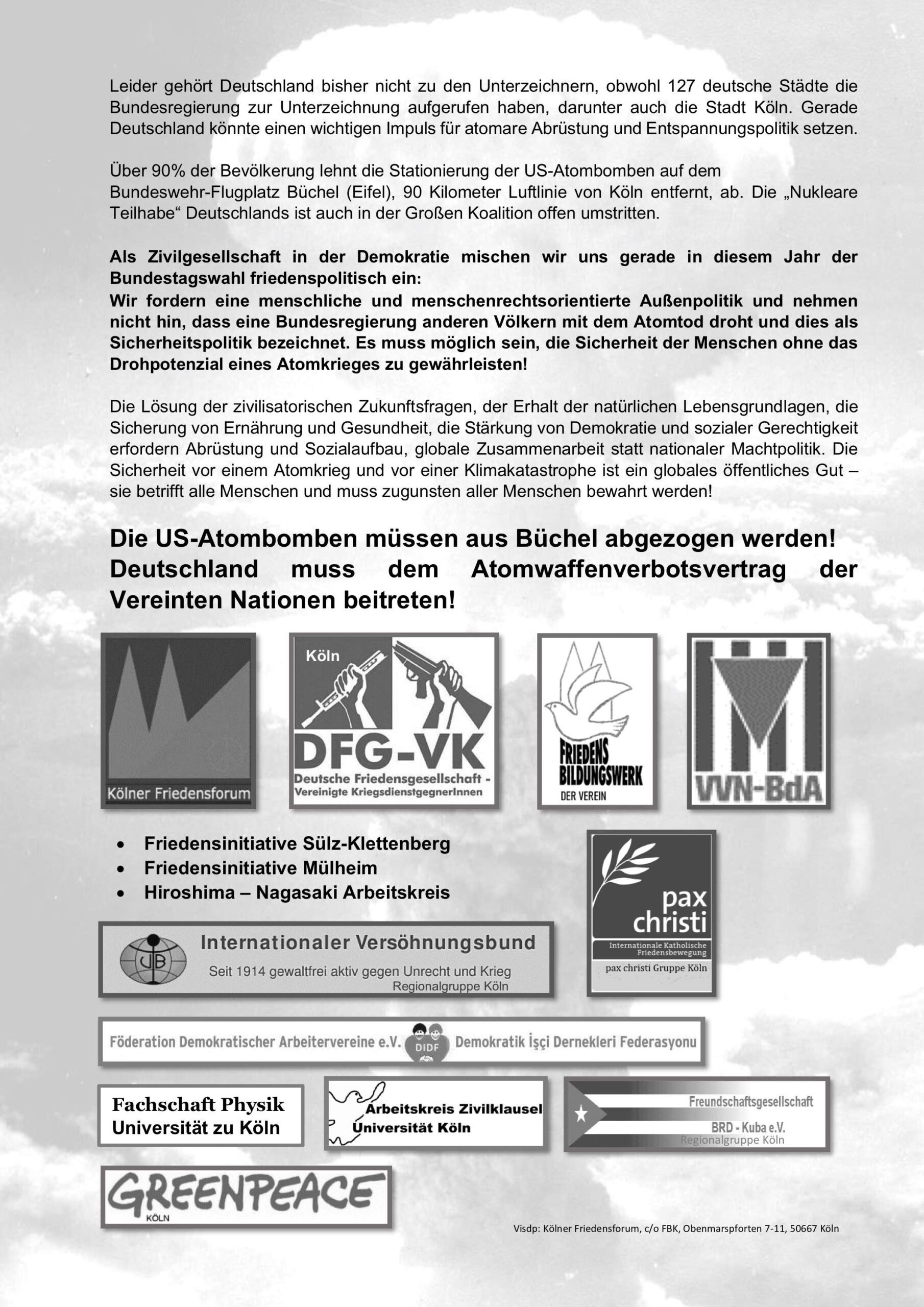 Über 90% der Bevölkerung lehnt die Stationierung der US-Atombomben auf dem Bundeswehr-Flugplatz Büchel (Eifel), 90 Kilometer Luftlinie von Köln entfernt, ab. Die „Nukleare Teilhabe“ Deutschlands ist auch in der Großen Koalition offen umstritten.