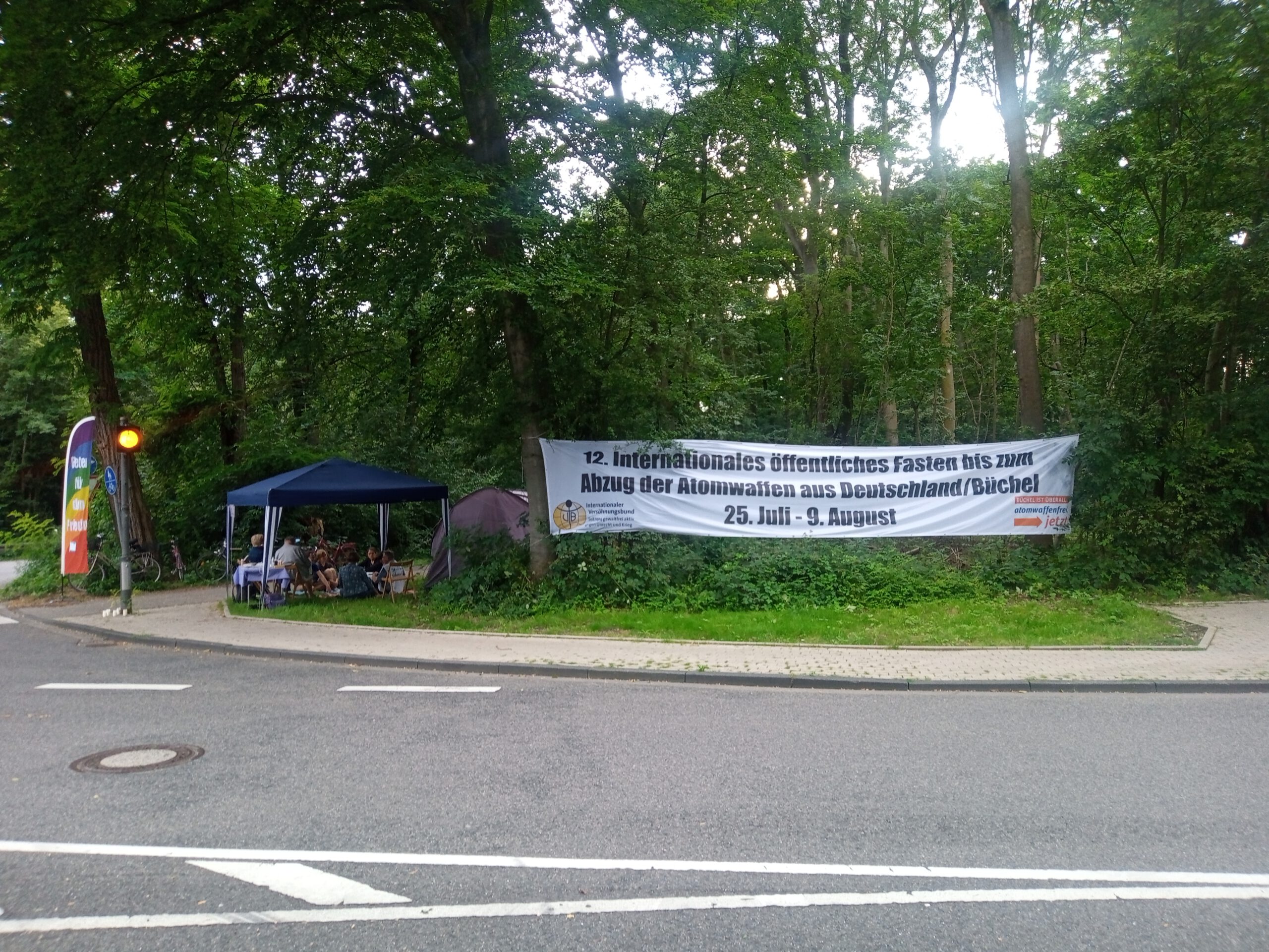 In Köln sind die Fastenden Tag und Nacht vom 29.-31.7. vor dem Personalamt der Bundeswehr, Militärringstr. 1000, 50737 Köln-Longerich vom 2.-4.8 vor dem Luftwaffenamt der Bundeswehr, Flughafenstr. 1, 51147 Porz-Wahn und am 6.8. bei der Kundgebung am Aachener Weiher ab 18.00 Uhr.