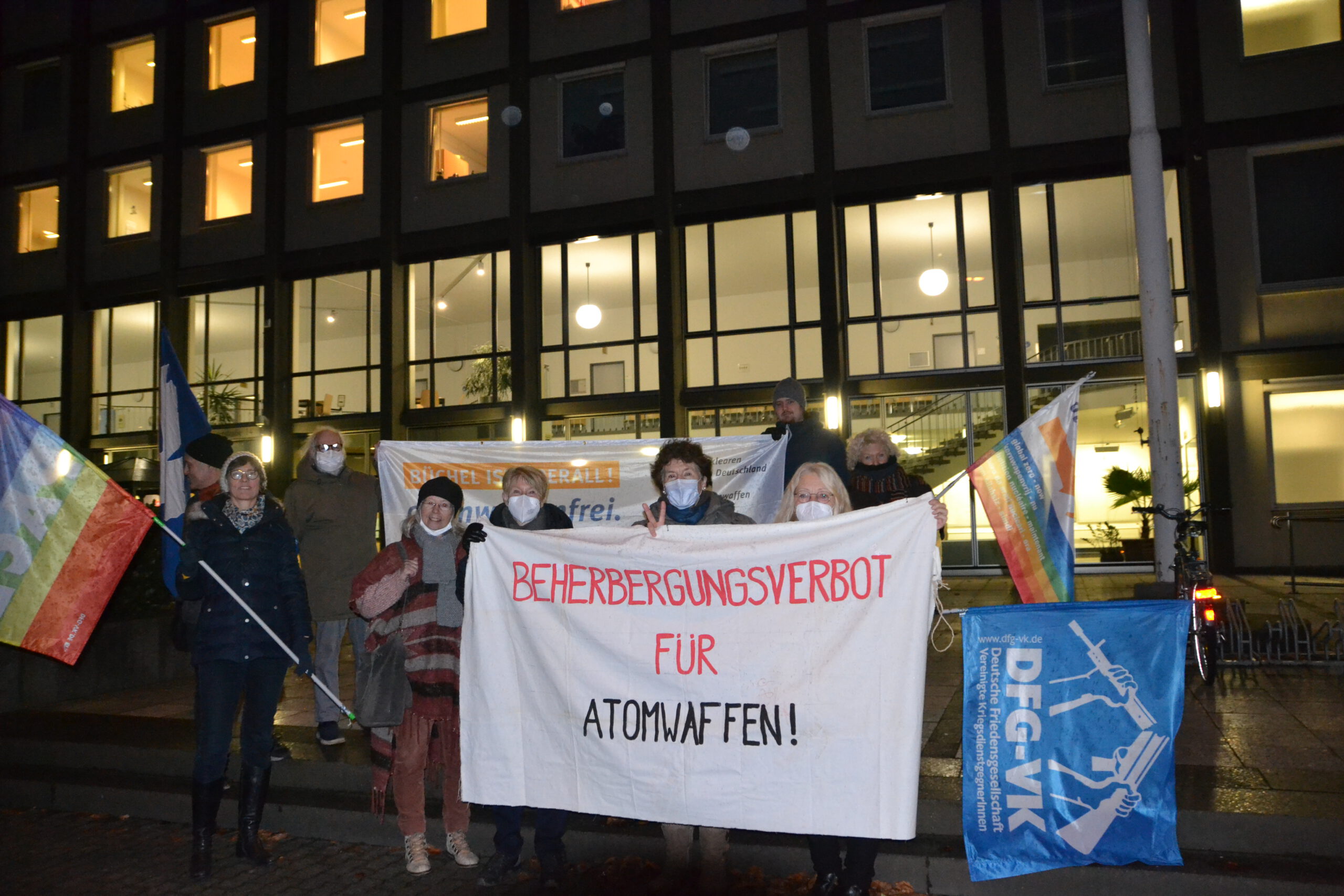 „Beherbergungsverbot für Atomwaffen!“ – Mahnwache vor dem Berufungsverfahren von Ariane Dettloff (2. v. l.) am Landgericht Koblenz am 6.1.2022. Foto: Stefanie Intveen