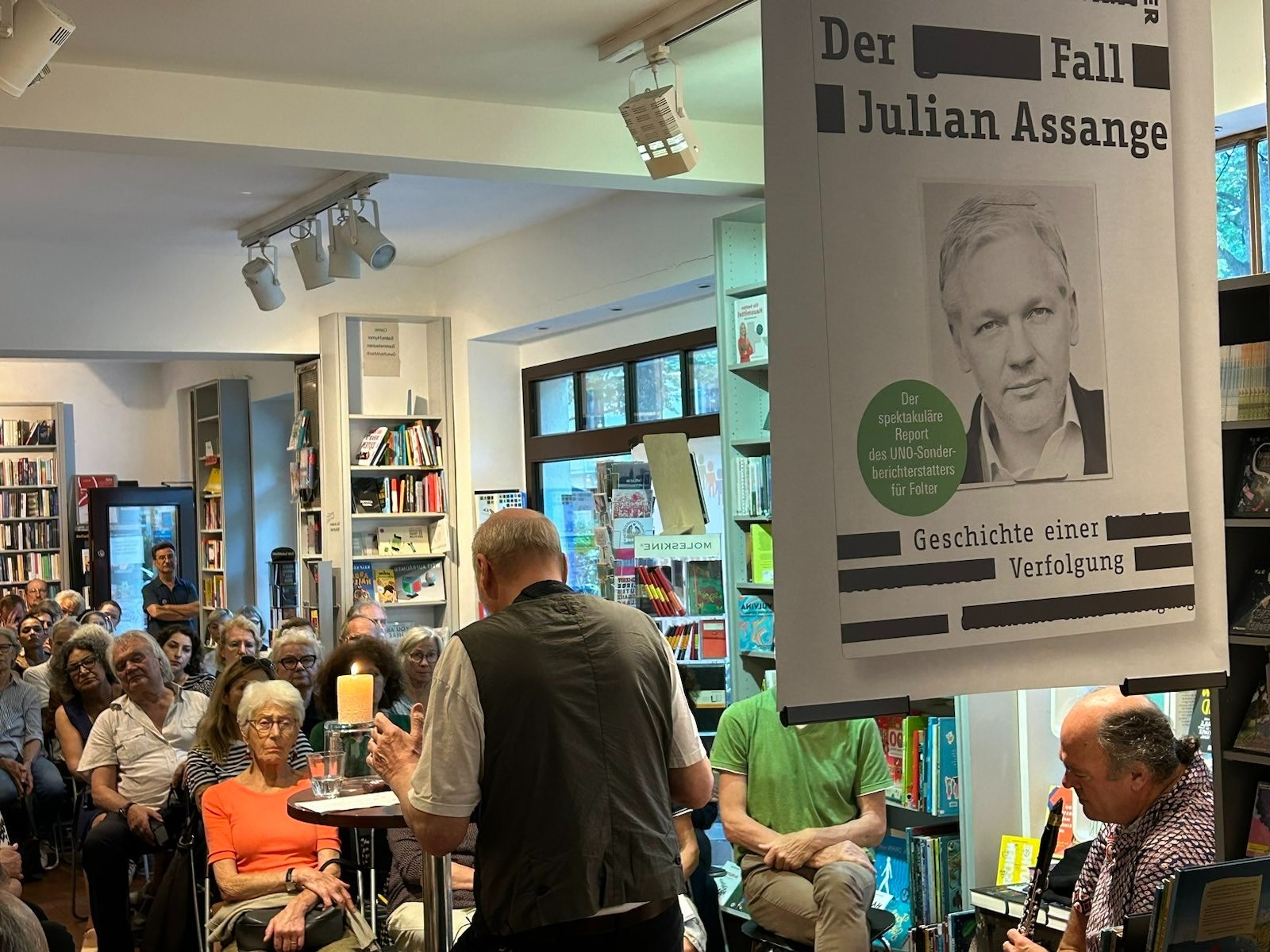 In dem bis auf den letzten Platz gefüllten Raum im „Der andere Buchladen“ in Köln-Sülz trug Tratnik ausgewählte Passage aus dem Buch über einen der größten Justizskandale aller Zeiten vor, während der Musiker Andreas Wagner auf der Klarinette zu den Texten improvisierte. Vielen Anwesenden waren die Einzelheiten und das schockierende Verhalten demokratischer Regierungen und rechtsstaatlicher Institutionen im Fall Assange bisher nicht bekannt.