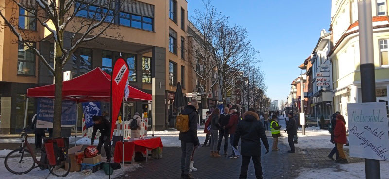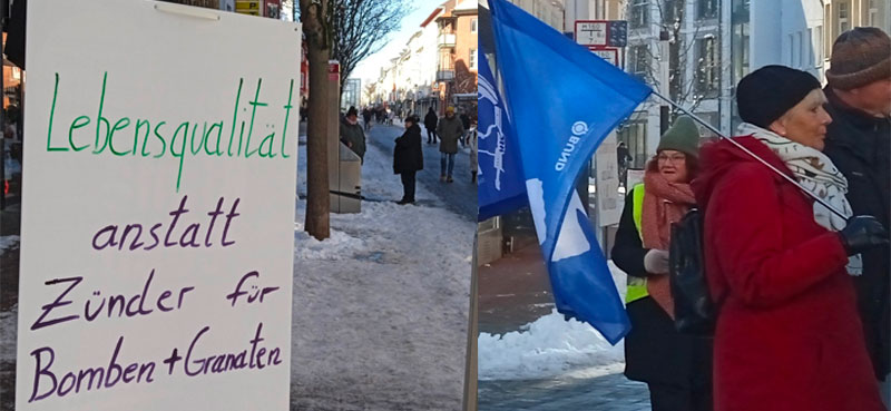 Bei strahlendem Sonnenschein und deutlichen Minustemperaturen haben wir am Samstag, den 20.01.2024 die Protestaktion gegen die Erweiterung der Munitionsfabrik begleitet. Über 300 Flyer wurden von den meisten Passanten mit Interesse entgegengenommen. In der Fußgängerzone konnten die circa 20 Aktiven des Aktionsbündnisses mit vielen Passanten intensive Gespräche führen. Das Interesse der Bürger war groß. Aus der Bevölkerung kamen Hinweise auf Sondermüllgruben auf dem ehemaligen Gelände von Dynamit Nobel.