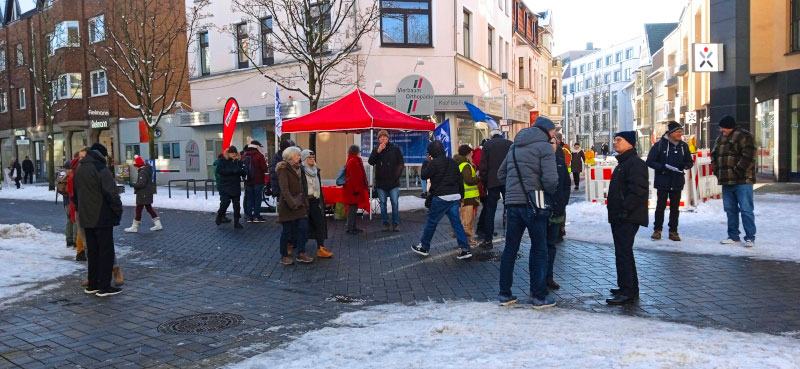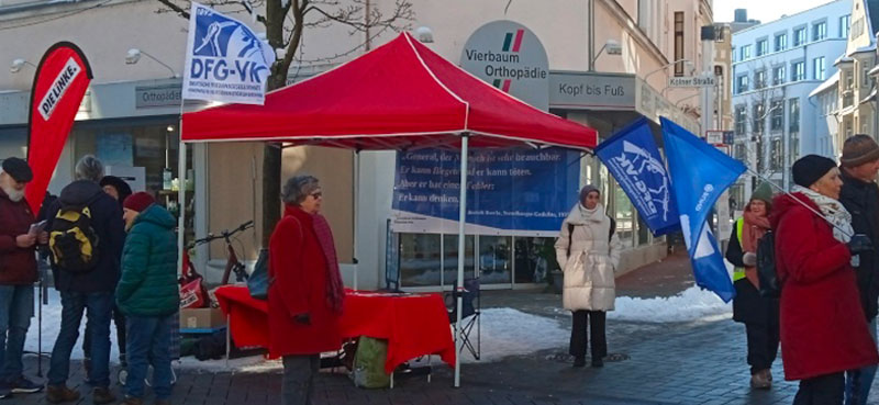 Überraschenderweise wussten doch eine Reihe Troisdorfer nicht einmal, dass unweit des Stadtzentrums und der Fußgängerzone Zünder für Kriegsmunition produziert werden. Einzelne Passanten äußerten Interesse daran, persönlich gegen die Rüstungsproduktion aktiv zu werden. Zum Abschluss erholten wir uns in einem naheliegenden Café, konnten uns aufwärmen und den weiteren Fortgang des Widerstand gegen das Rüstungsunternehmen Diehl Defense besprechen.