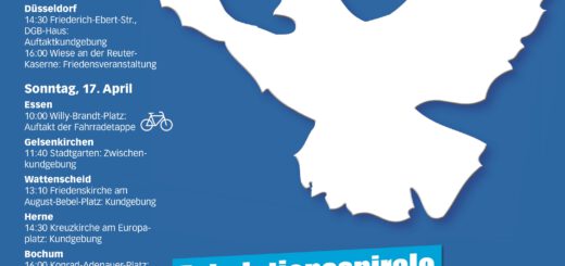 Das Ostermarsch-Team Rhein Ruhr freut sich auf ein gemeinsames Peace-Happening am 1. April in Dortmund. Auftakt ist um 13:30 in Dorstfeld auf dem Wilhelmplatz.