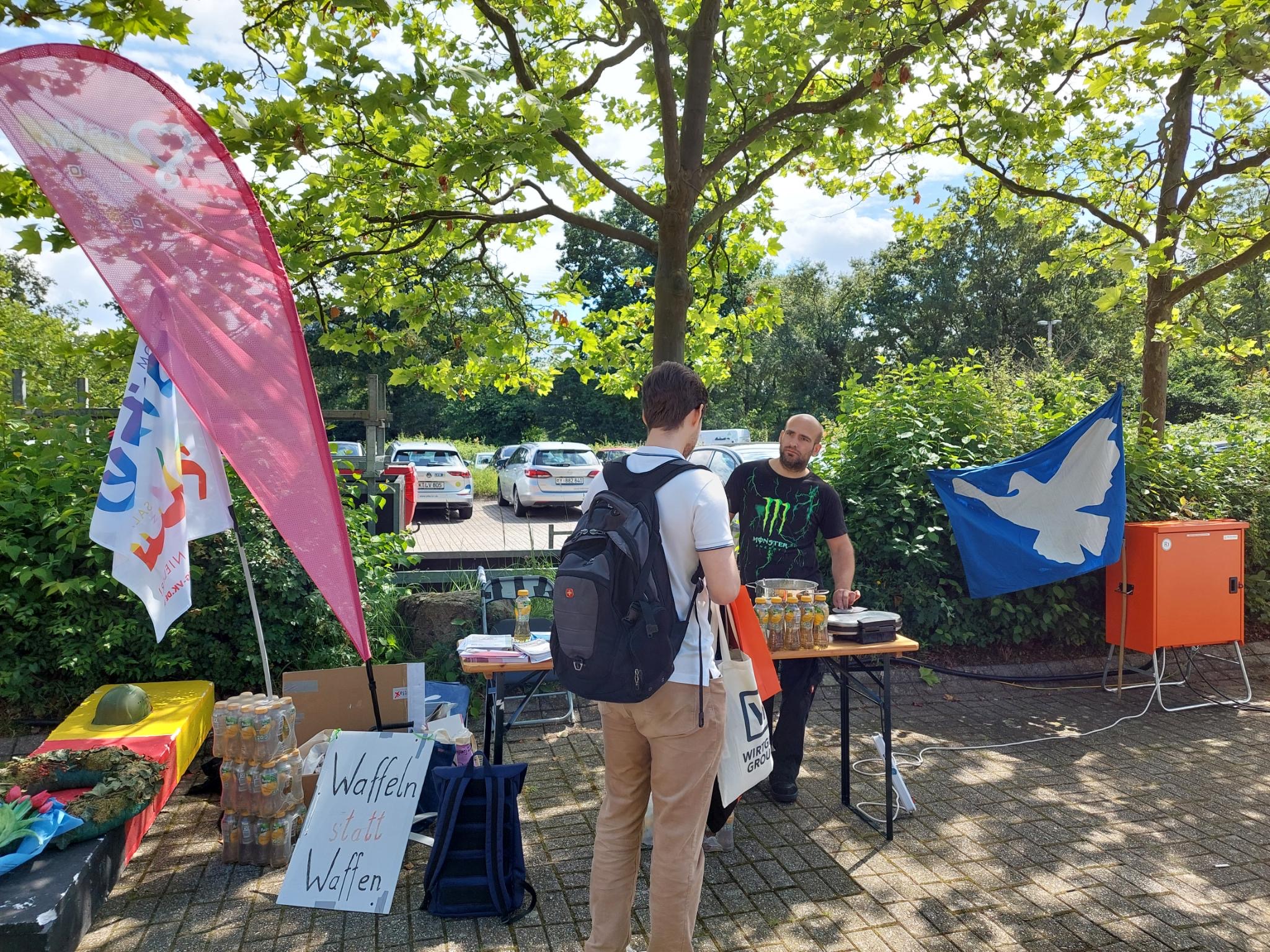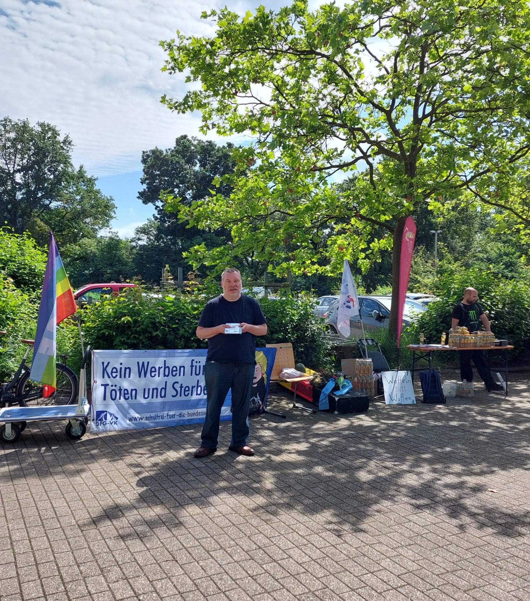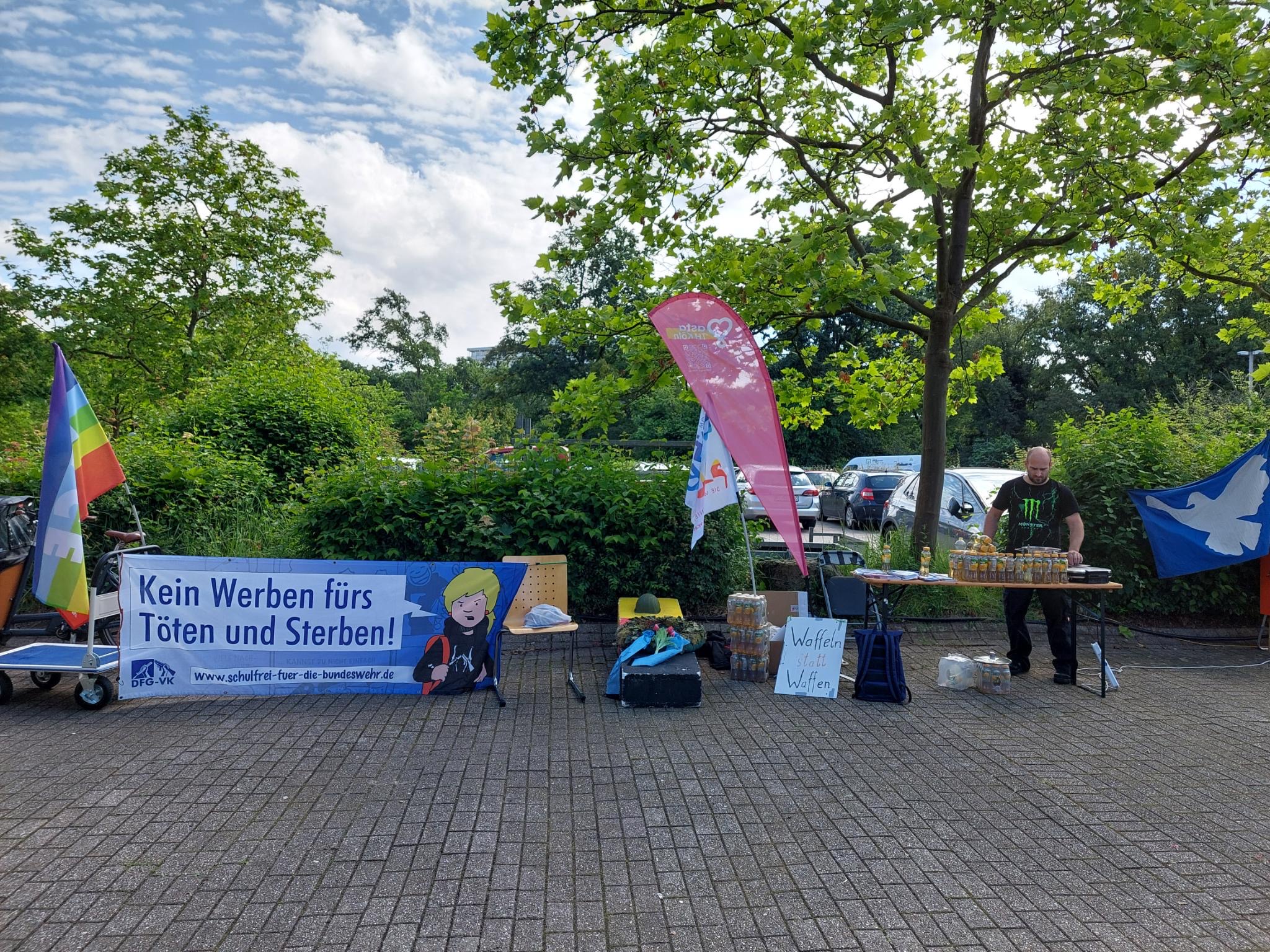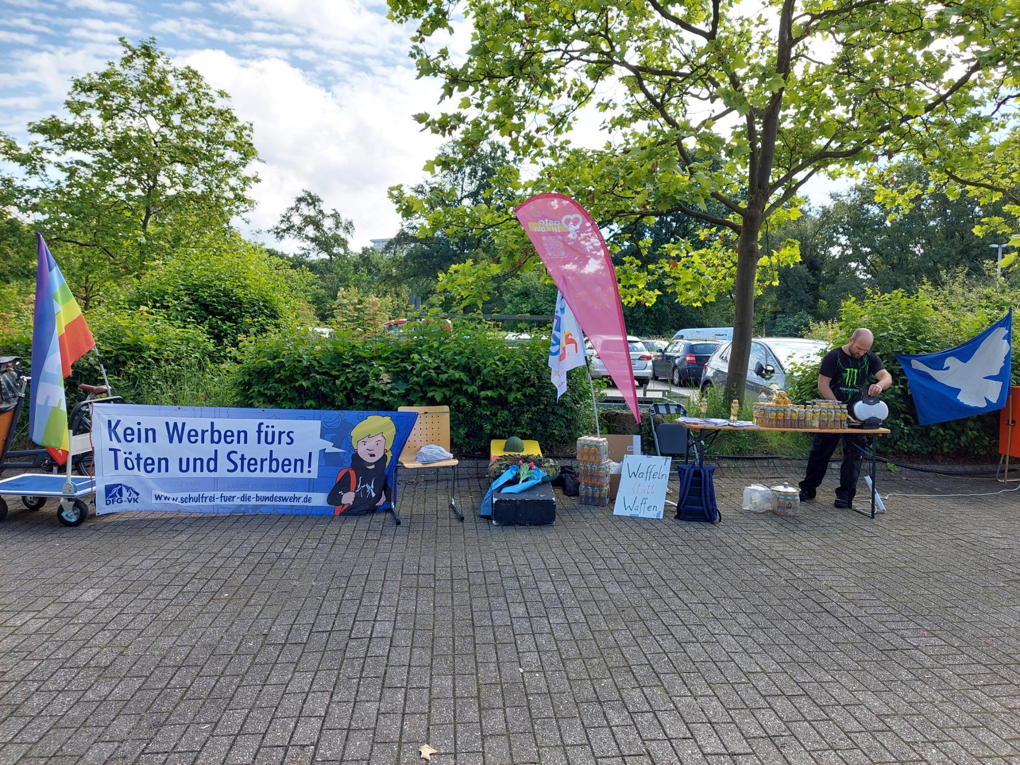 Der AStA hat dann einen Waffelstand organisiert, Motto „Waffeln statt Waffen“. Dieser und der Infotisch wurden gut angenommen. Es war eine tolle Werbung für den Frieden! Seitens der DFG-VK hatten 6 Mitglieder an dieser konstruktiven und Kräfte bündelnden Kooperation mit dem ASTA teilgenommen. Das Motto „Waffeln statt Waffen“ hat gut gegriffen und Studierende und Aussteller an den Stand geholt. Und der mit Friedensfahnen und Anti-Kriegstransparenten geschmückte und mit einem symbolischen „Sarg“ verzierte DFG-VK Stand hat die, überwiegend jungen, Menschen zu Fragen animiert. „Was ist die DFG-VK, seid ihr eine Partei, was sind eure Ziele,…..?“ Die Themen Eskalation von Gewalt, Deeskalationsstrategien, Rüstungsexporte, Wehrpflicht, Wehretat, Krieg, Tod und Sterben und Desertion wurden zum Teil intensiv diskutiert. Alle Gespräche und Diskussionen waren konstruktiv, gleichberechtigt und mit Respekt geführt!