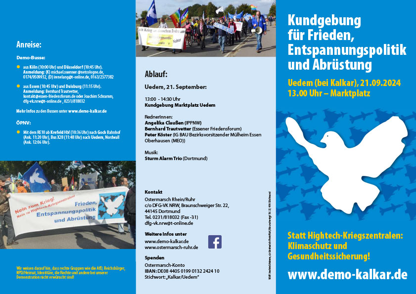 Deshalb rufen wir – der Ostermarsch Rhein/Ruhr sowie Friedensgruppen von Rhein und Ruhr – für den 21. September zur Friedenskundgebung, die an den 2+4-Vertrag erinnert, nach Uedem auf!