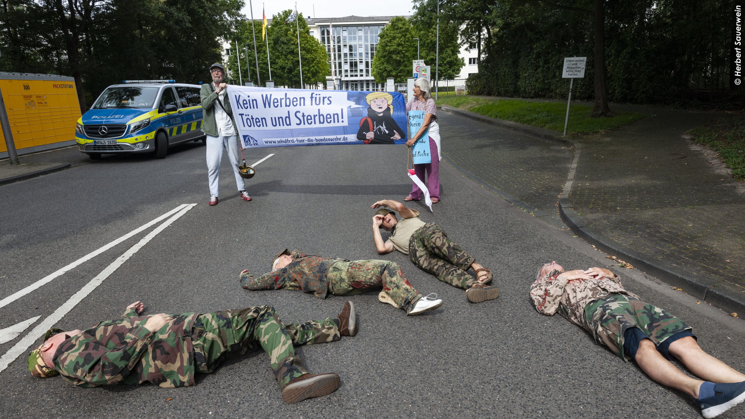 Um dies aufzuzeigen sind wir vor die Lüttich-Kaserne gezogen; mit der Aufforderung keine Jugendlichen für das Töten und Sterben zu werben, und der Erinnerung daran, dass Kriegsgerät kein Spielzeug für Jugendliche ist. Um das eigentliche Wirken der Bundeswehr zu veranschaulichen, inszenierten einige von uns das Sterben durch Krieg.