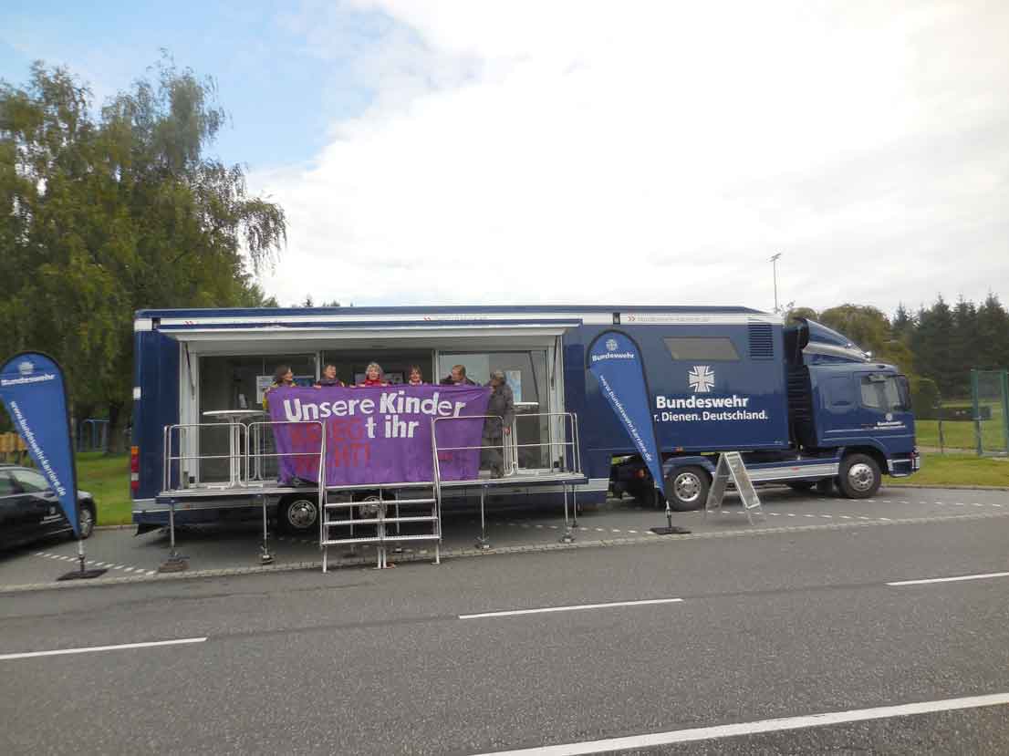 Am 24. 9. 15 wurde der Propagandatruck der Bundeswehr vor dem Haupttor des Atomwaffenstandortes Büchel (Eifel) von sechs mutigen Frauen in dieser Region besetzt. Die Bundeswehr wirbt dort für einen der fürchterlichsten Jobs, nämlich im Rahmen der atomaren Teilhabe das Üben des Abwurfs von amerikanischen Atomwaffen, die dort gelagert und in Zukunft durch neue, präzisere ersetzt werden sollen. (siehe den Fernsehbeitrag des ZDF-Magazins Frontal21 vor zwei Tagen). Die Gruppe konnte singend über eine Stunde diesen Truck mit ihrem Transparent: „Unsere Kinder kriegt Ihr nicht“ besetzt halten, bis die Polizei sie zwang, sich zu entfernen. Demnächst ist die nächste Aktion geplant. Die Gruppe, die sich Gewaltfreie Aktion Büchel nennt, würde sich um weitere Verstärkung freuen. Kontakt über: ga-buechel@gmx.de