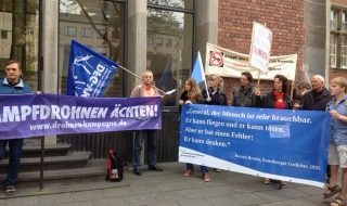 Am Samstag, den 11. Juni 2016, fanden unter dem Motto „Stopp Ramstein“ in Kaiserslautern, Landstuhl und Ramstein-Miesenbach zunächst ab zwölf Uhr mittags drei getrennte Kundgebungen statt, die später zu einer Menschenkette vereinigt werden sollten. Insbesondere die über Ramstein gesteuerten Drohnenmorde und die imperialen Einsätze der Vereinigten Staaten und der NATO von diesem Militärstützpunkt aus standen im Fokus der Demonstrierenden. Wir, eine kleine Gruppe von Aktiven und Freunden der Kölner DFG-VK, standen nach etwa zweistündiger Autofahrt mit etwa 500 Friedensaktivisten bei der Kundgebung in Landstuhl und hörten dort Reden von (unter anderen) Roland Blach, dem Landesgeschäftsführer der DFG-VK Baden-Württemberg, und Ray McGovern, einem ehemaligen Analysten der CIA.