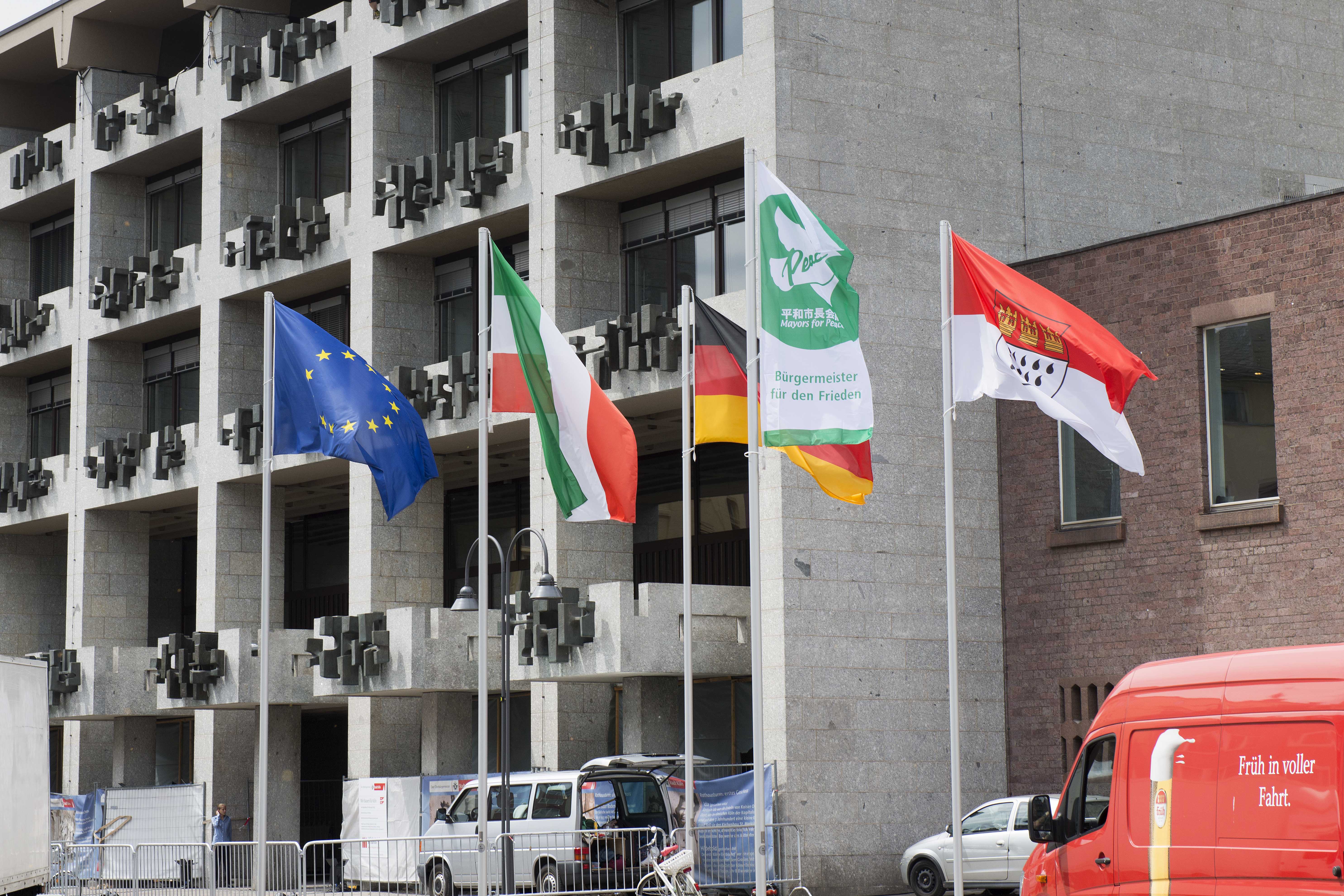 Am 8. 7. 2016 wurde auf dem Alter Markt am Kölner Rathaus die Friedensfahne der „Mayors for Peace“ gehisst. Damit wurde für die weltweite Abschaffung aller Atomwaffen geworben und an ein Rechtsgutachten des Internationalen Gerichtshofs in Den Haag vom 8. Juli 1996 erinnert. Darin heißt es, dass die Androhung und der Einsatz von Atomwaffen generell mit den Regeln des humanitären Kriegsvölkerrechts unvereinbar sind.