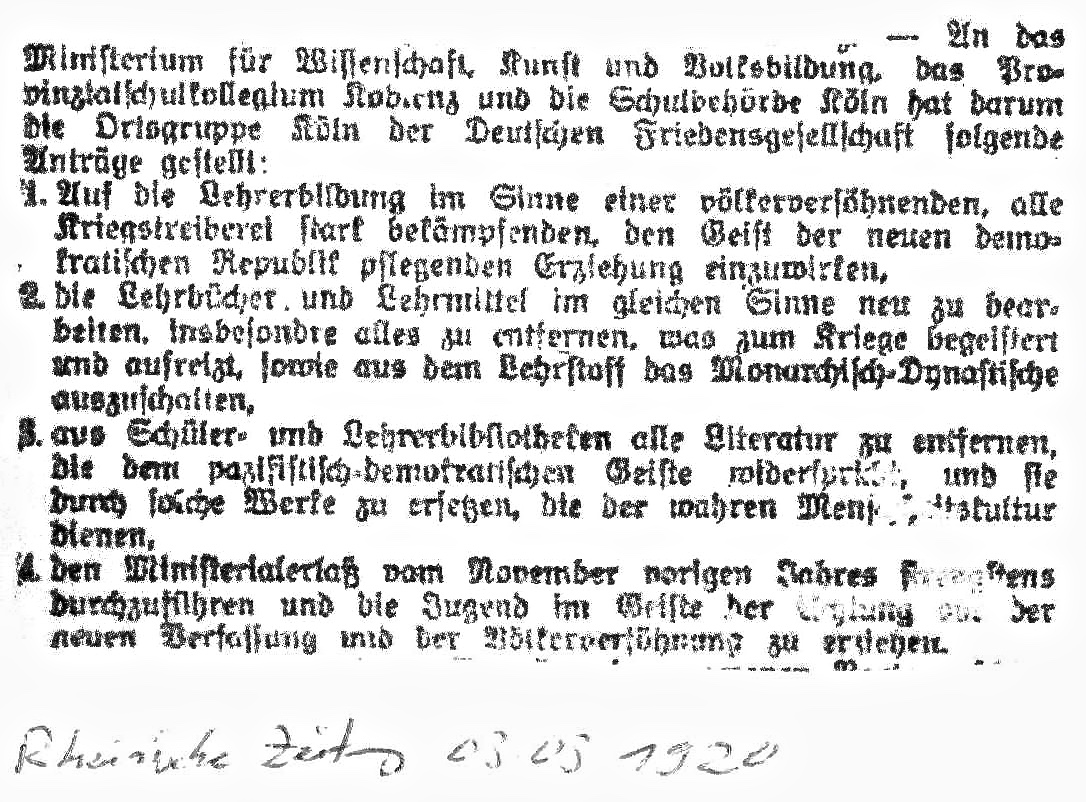 „An das Ministerium (…) hat darum die Ortsgruppe Köln der Deutschen Friedensgesellschaft folgende Anträge gestellt (…)“. Rheinische Zeitung vom 9. März 1920