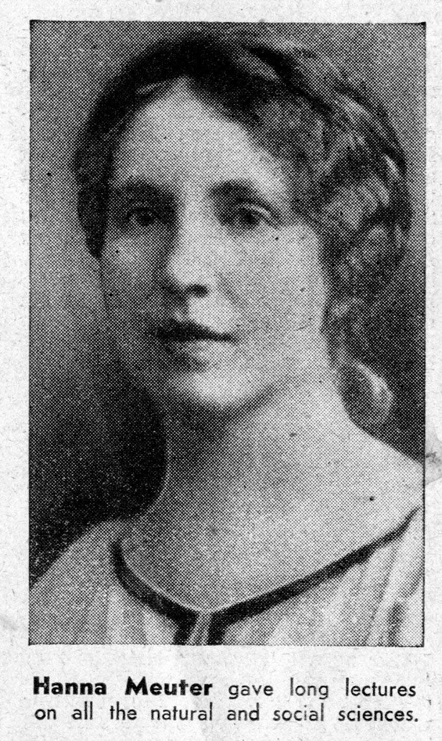 Das Ruder übernahmen vornehmlich sozialdemokratisch orientierte Menschen, die entweder bereits vor dem Krieg pazifistischen Gedanken nahe gestanden hatten oder durch die Kriegserlebnisse desillusioniert waren. Eine herausragende Rolle spielten Karl Meuter1, der vor allem organisatorisch tätig war, und seine Tochter Hanna2, die während des größten Teil der 1920er Jahre Vorsitzende der Gruppe war.