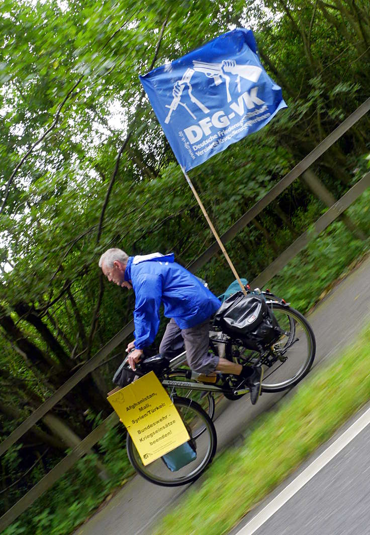 Michael Sünner von der Gruppe Köln auf der Friedensfahrradtour 2016 des Landesverbandes NRW der DFG-VK. Foto: Bodo Schmitz, www.mutbuergerdokus.de.