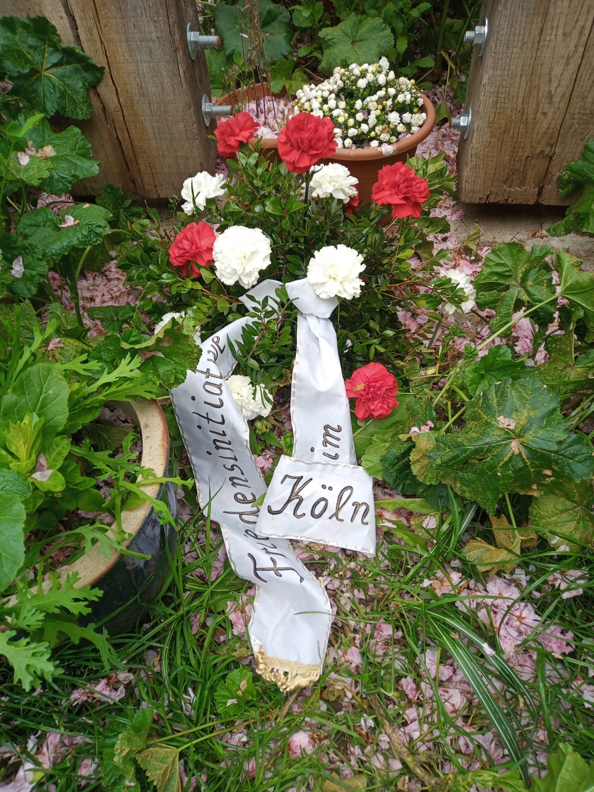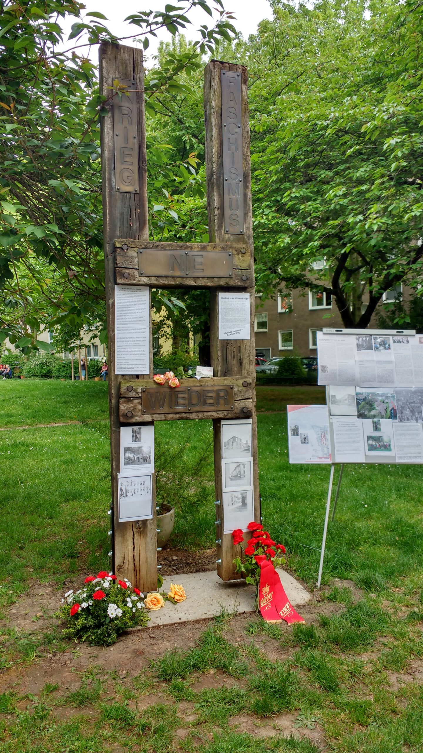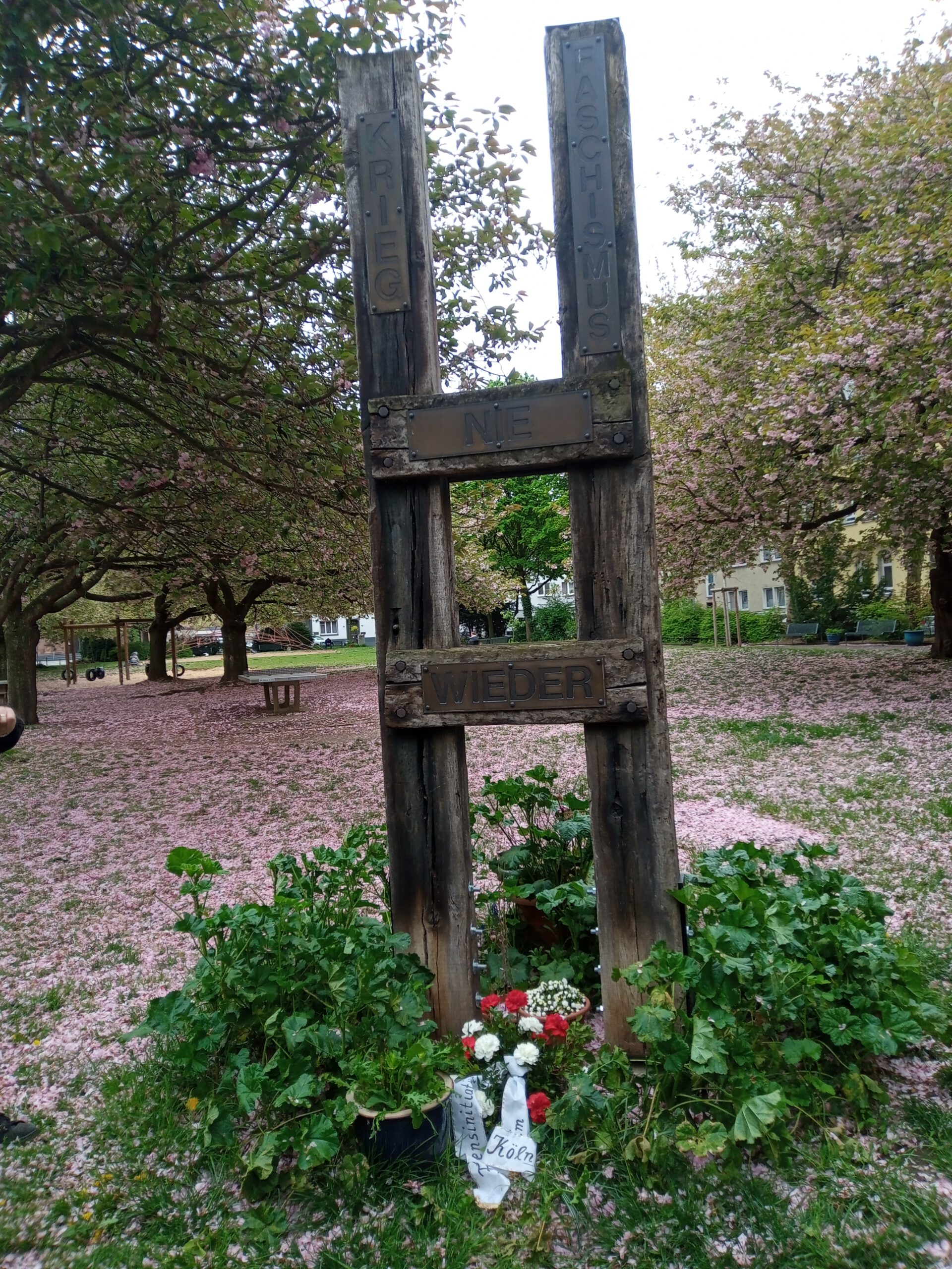 Zwischen Wallstr. und Regentenstr. in Köln-Mülheim befindet sich der Ratsplatz, an dem vor der Bombardierung Mülheims im 2.Weltkrieg das alte Mülheimer Rathaus stand. Dort steht das Mahnmal „Nie wieder Krieg – Nie wieder Faschismus“. Es soll die Erinnerung an die grausigsten 12 Jahre und 4 Monate NS-Zeit wachhalten. Die Friedensinitiative Mülheim lädt jeweils zum 08.05. und 01.09. an diesem Ort zum Gedenken gegen Faschismus und Krieg ein.