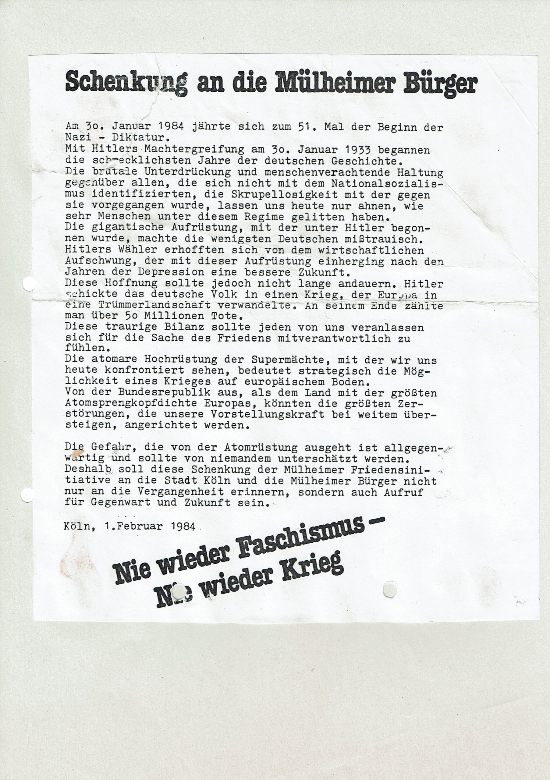 Das Mahnmal wurde erstmalig zum 30. Januar 1984 am Wiener Platz aufgestellt, dem neuen Zentrum Mülheims der Nachkriegszeit. Zu jener Zeit von Hochrüstung und Nato-Doppelbeschluss war es ein Geschenk der Friedensinitiative an die Mülheimer „Bürger“. Die Erklärung zur Schenkung vom 01.02.1984 ist auf dieser Tafel zu lesen: