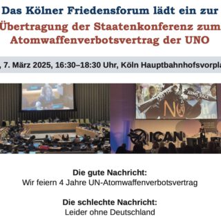 Wir laden ein: Übertragung der Staatenkonferenz zum Atomwaffenverbotsvertrag der UNO am Freitag, 7. März 2025, 16:30–18:30 Uhr, Köln Hauptbahnhofsvorplatz Die gute Nachricht: Wir feiern 4 Jahre UN-Atomwaffenverbotsvertrag Die schlechte Nachricht: Leider ohne Deutschland 122 Staaten...
