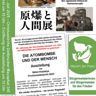 Veranstaltungen zum 80-jährigen Hiroshima-Nagasaki-Gedenken (Das Ganze als pdf herunterladen) „Die Atombombe und der Mensch“ – Ausstellung vom 06. Juli bis 31. August Nihon Hidankyo, die Organisation der Überlebenden der Atombombenabwürfe auf Hiroshima und Nagasaii,...